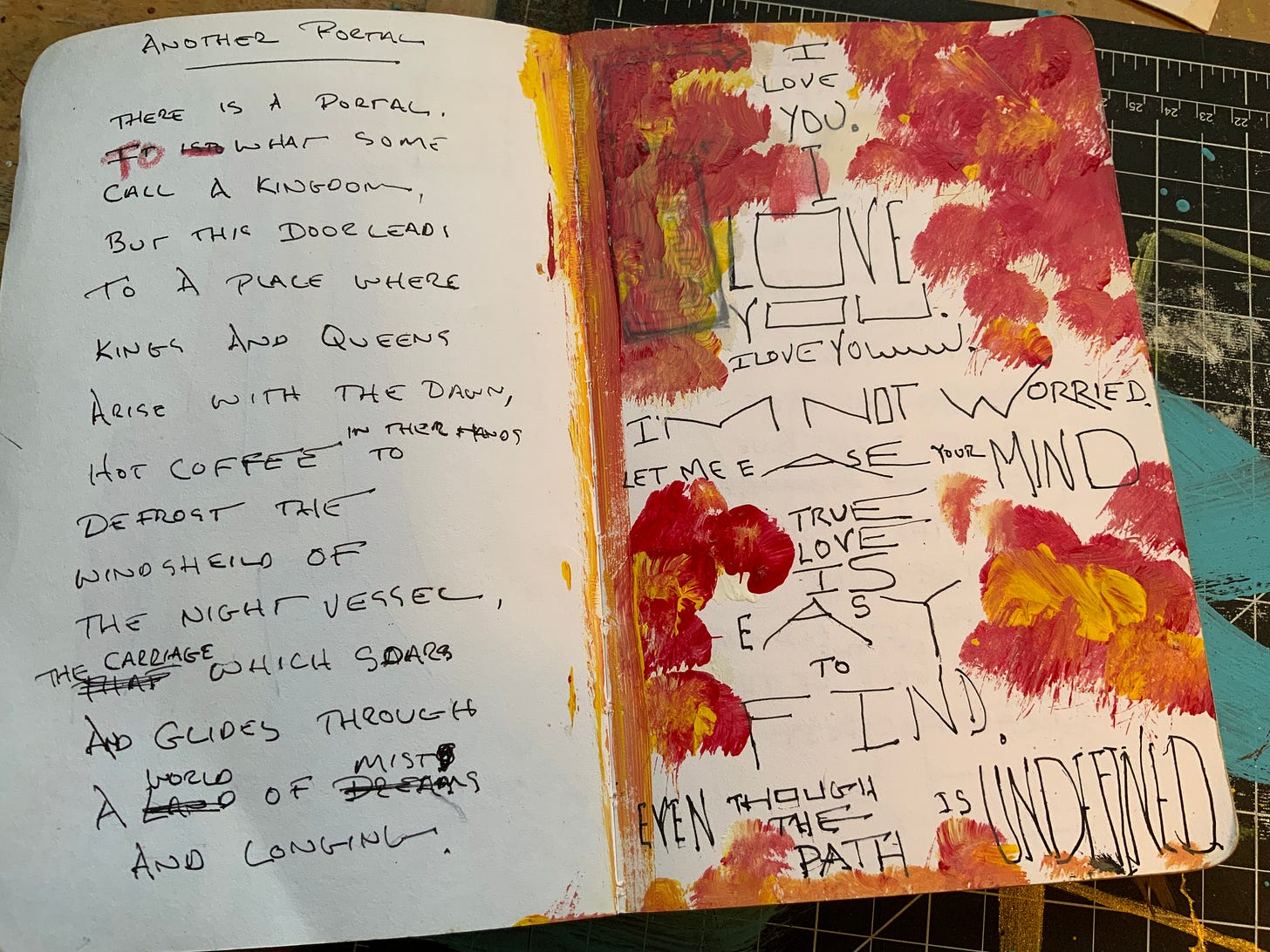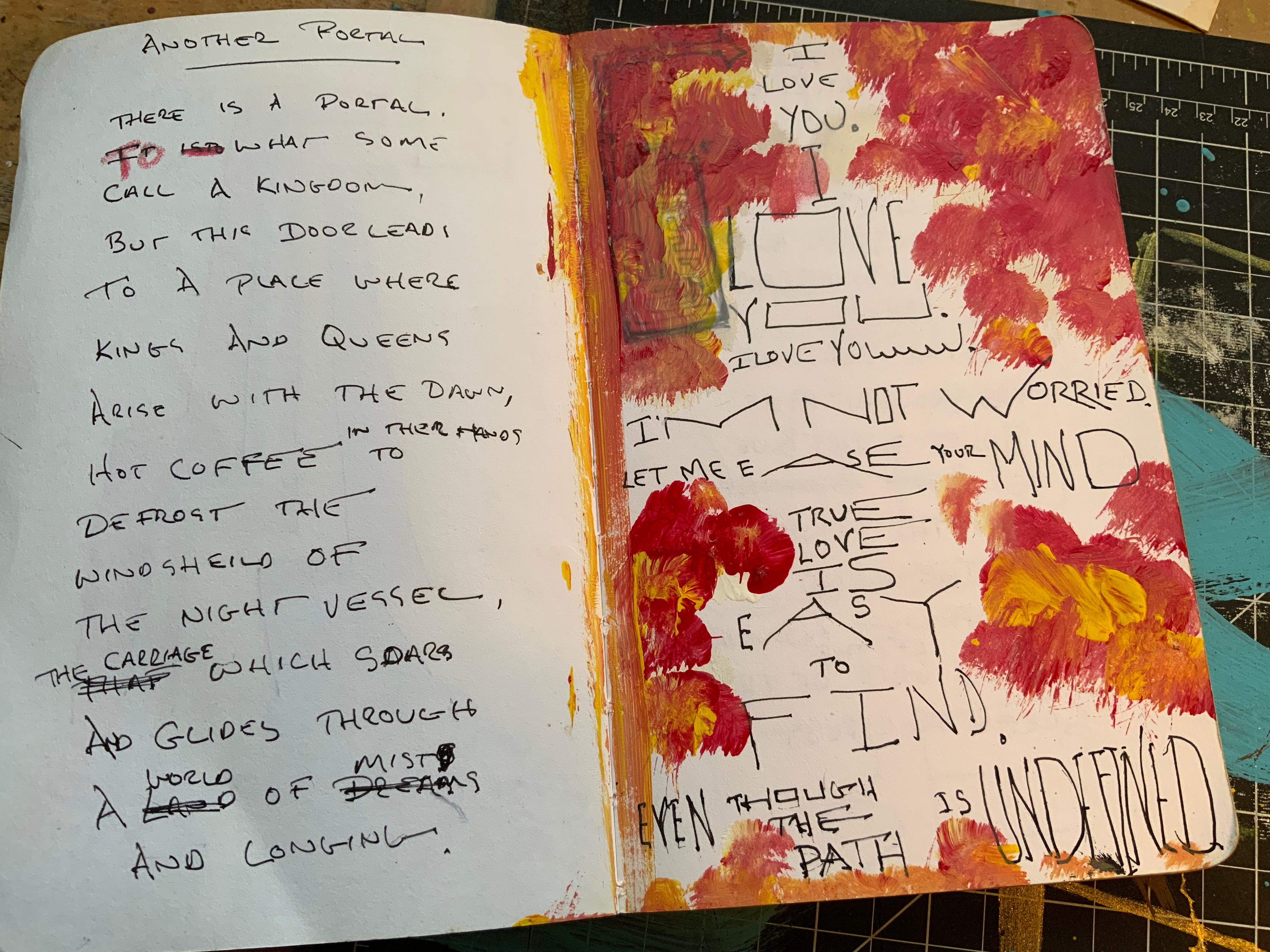 I liken the mysterious messages, from myself to myself, as a map that defines a place that is not a place. They allow me to recall thoughts and feelings from a moment in time, long forgotten. The scribblings are a way to connect with meaningful and significant points along the journey. When I look at a page, I often recollect the place, time, sounds, smells and other memories associated with the moment, even though they aren’t specifically written. A title or lyric will re-emerge after years of dormancy. It springs back with enthusiasm, like being on hold and finally getting through to a favorite call-in show.