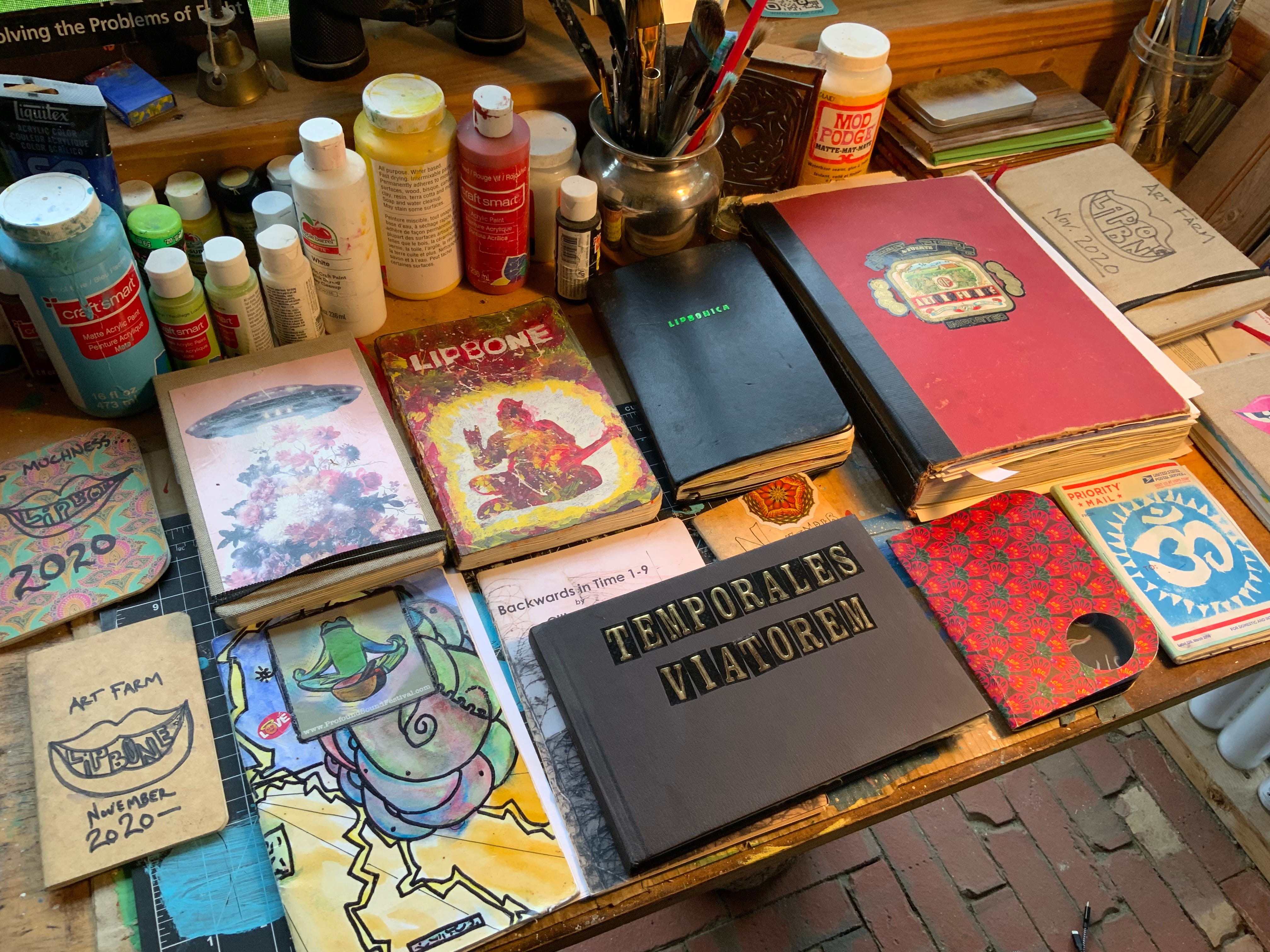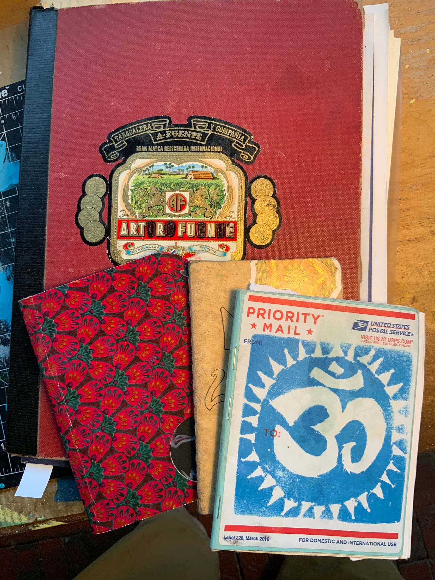 I generally tend to have a variety of notebooks open and going at once. One type of small notebook is for ideas, and another type, I make from scrap paper, and those are usually for lists. I almost always have a mothership notebook in process, for dedicated exploration of ideas. These can take years to fill up. The mothership books are a bit larger, and have a more permanent feel, but can still travel well in a backpack or guitar case.