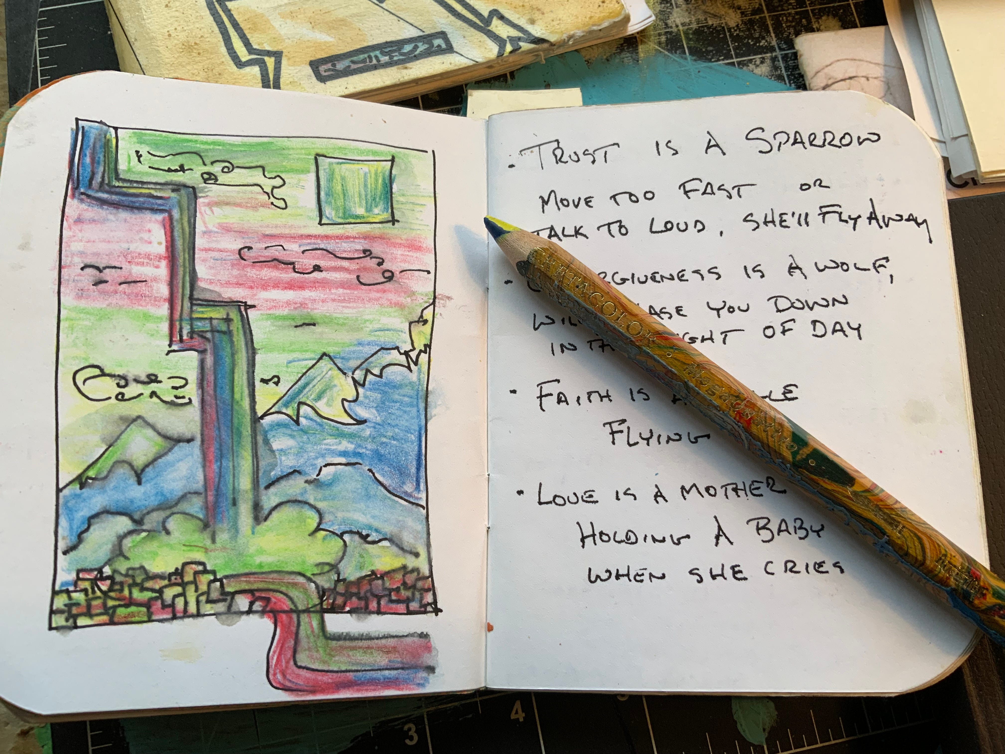 About 7 years ago, an artist was sketching my performance at the Rock N’ Roll Cafe in Barcelona. Afterwards he handed me a portrait, and during our conversation, I showed him one of my tiny notebooks. Knowing exactly what I needed to lift my game, he gifted me a multi-color watercolor pencil. All over Europe, I added those magical colors to my pocket-sized notebook. By the end of the tour, that pencil was no more than a nub. I eventually found some similar multi-colored pencils back home, but none will ever compare to the brilliance and psychedelic hues of that which was freely given from the heart of an artist.